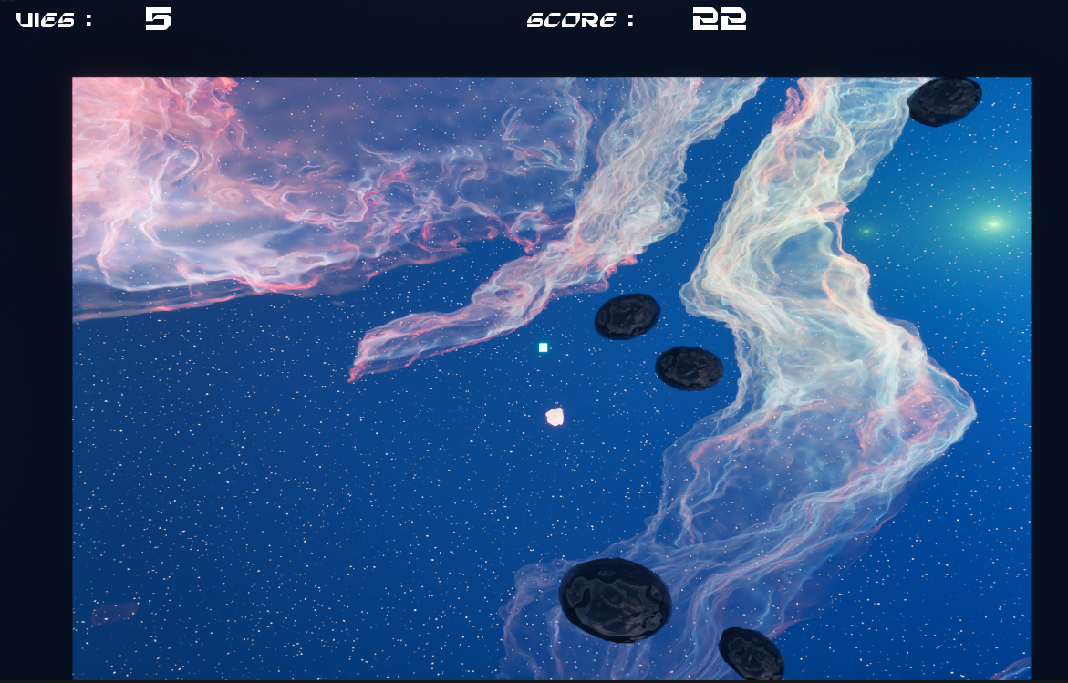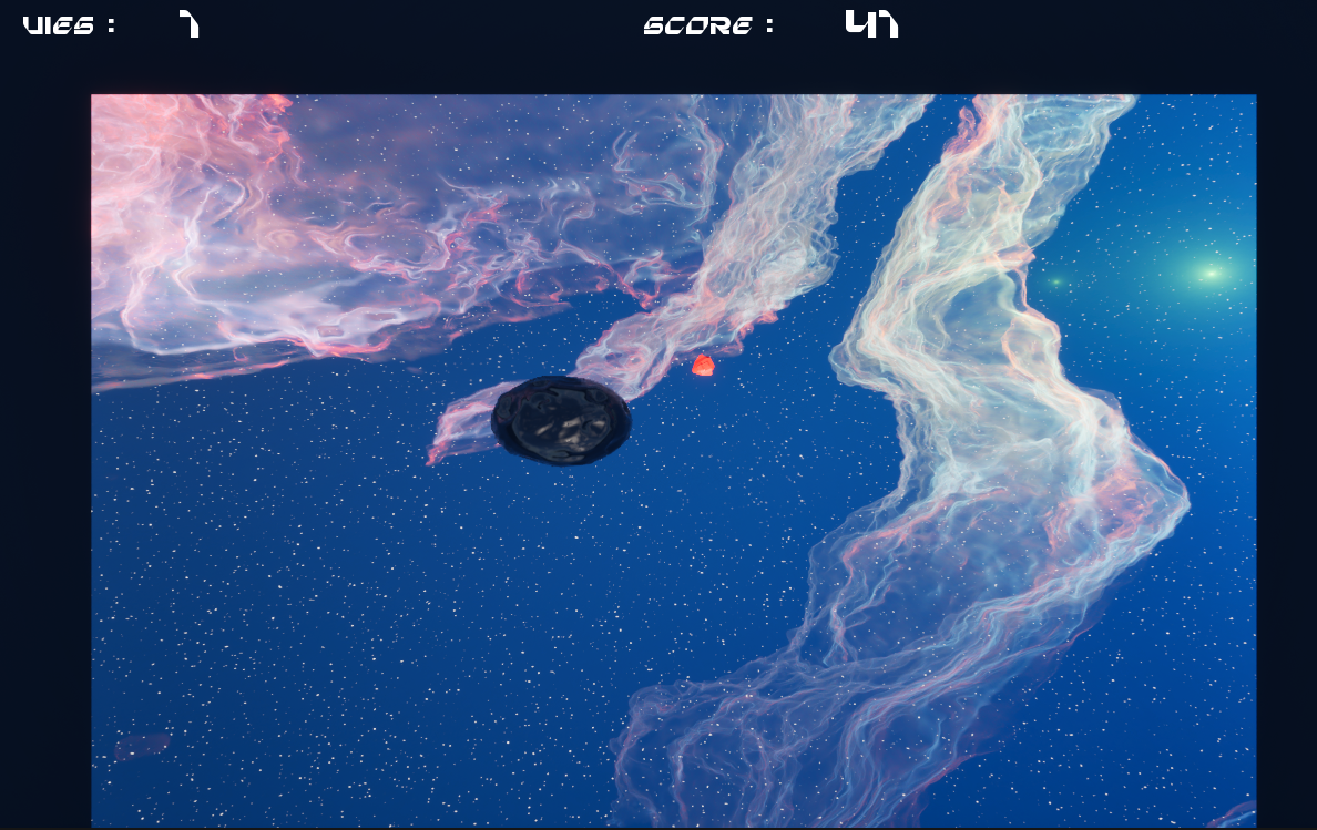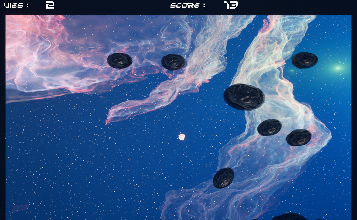 The player controls a fully visible ship capable of moving in all directions. The ship can shoot projectiles to destroy incoming asteroids, creating dynamic gameplay.